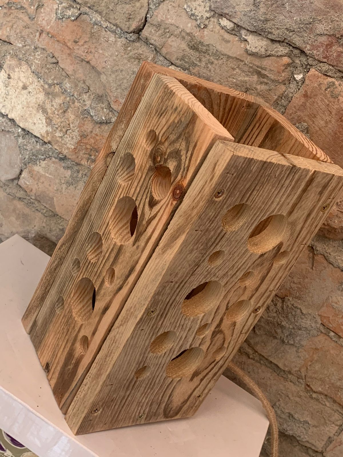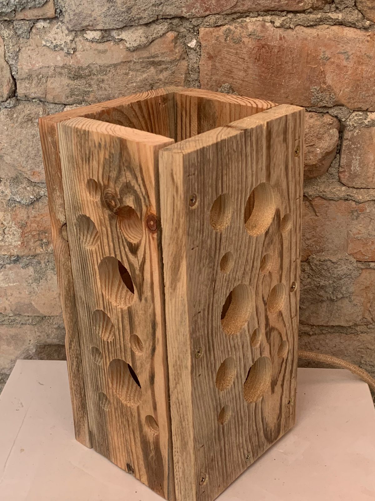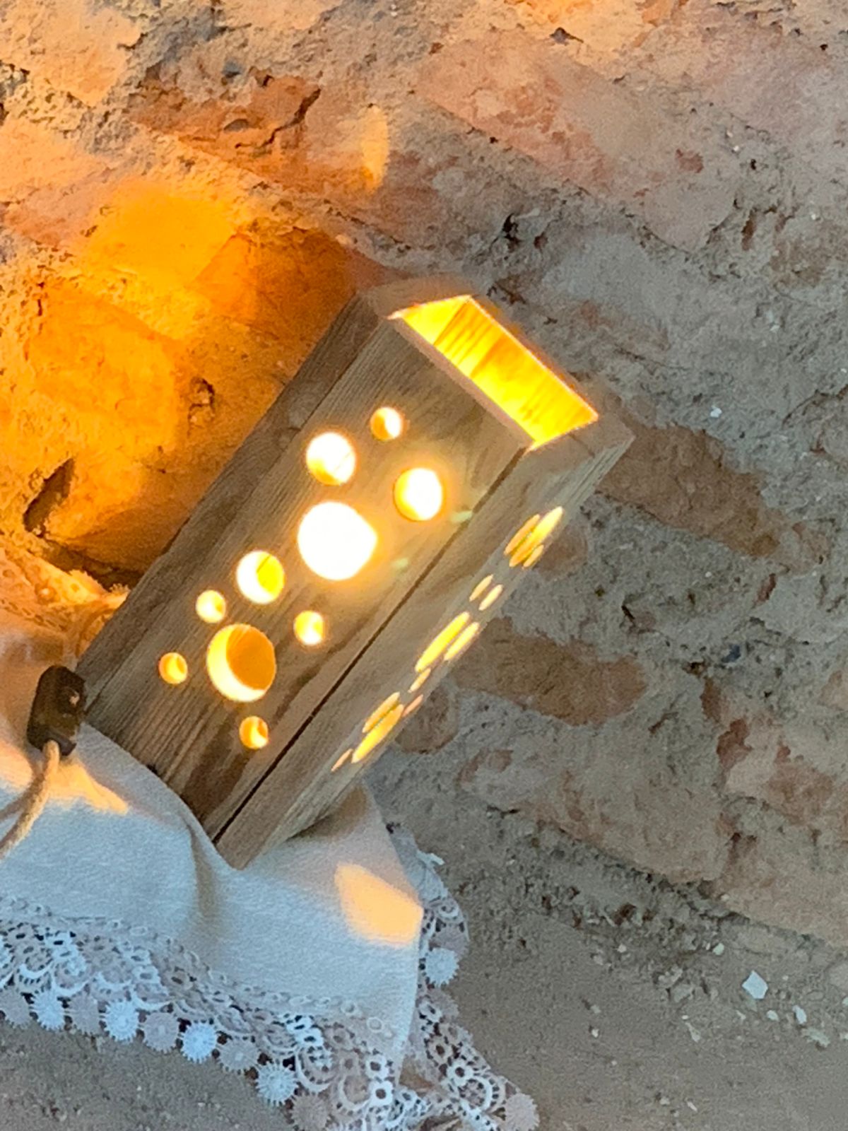 Kjo llambë e punuar me dorë nga dru natyral është shumë më tepër sesa një burim drite   është një copë art dhe ngrohtësie. Çdo vrimë dekorative është prerë me kujdes për të krijuar një lojë magjike drite dhe hije, e cila sjell një ndjesi qetësie dhe harmonie në çdo ambient.