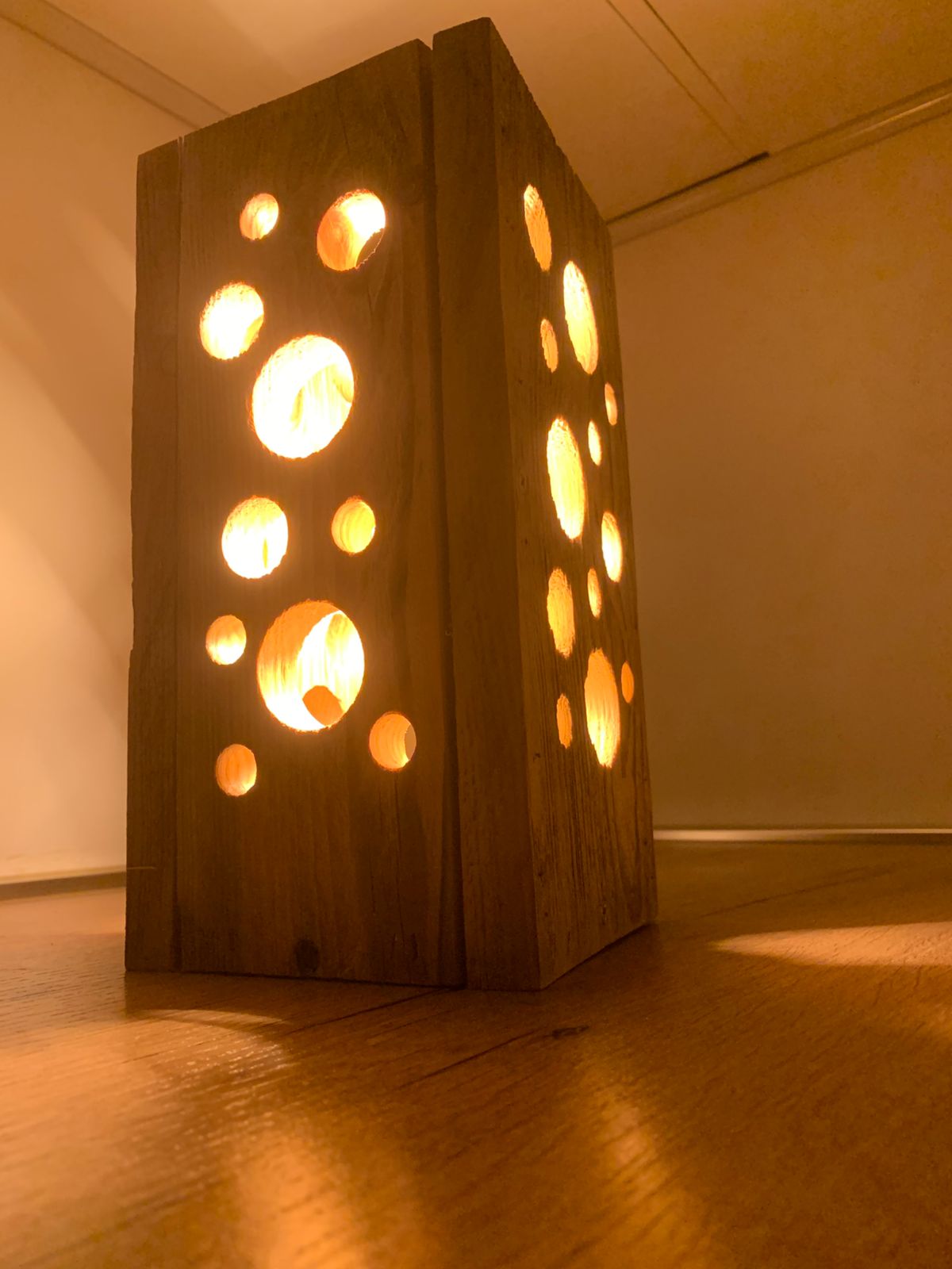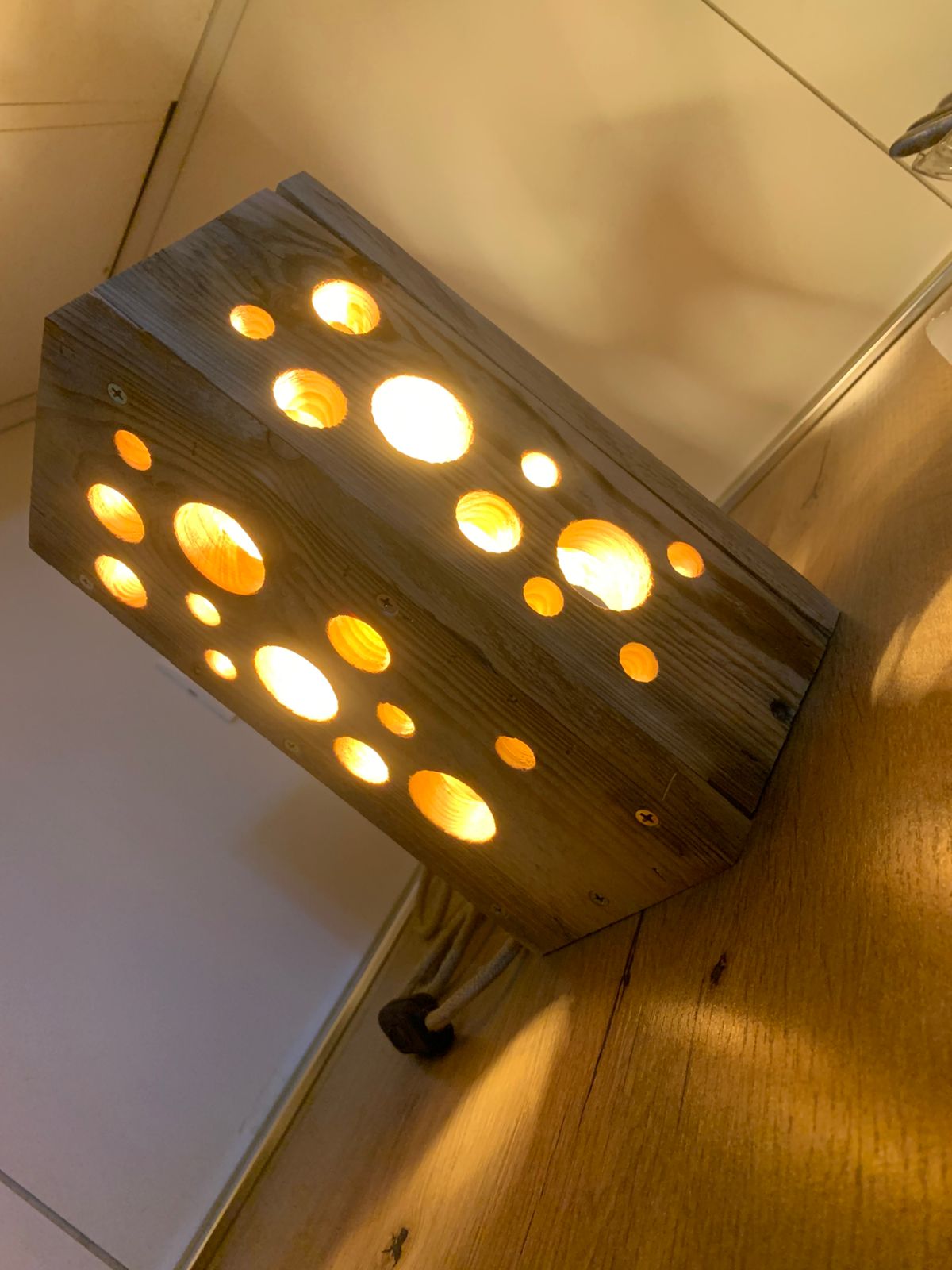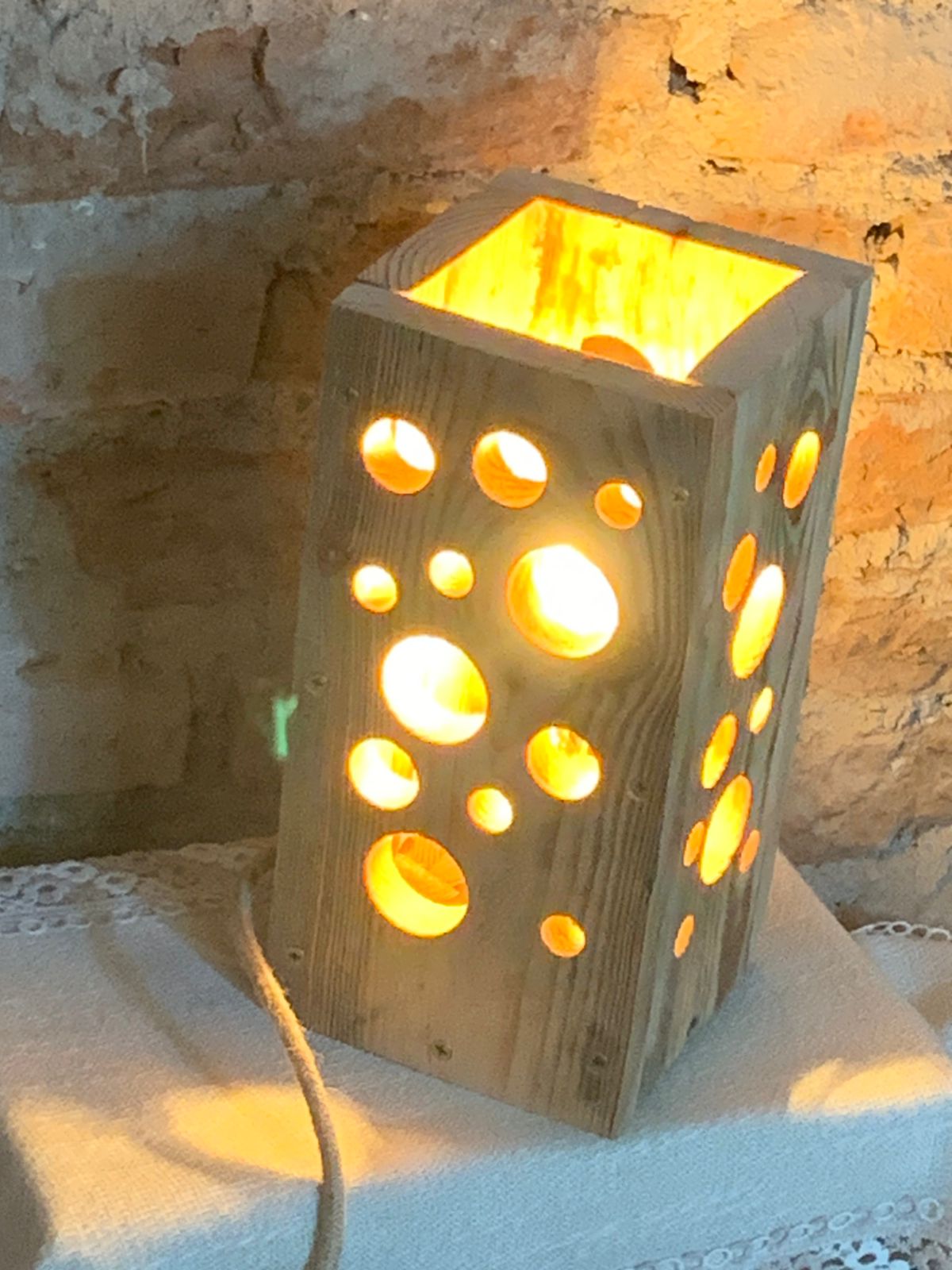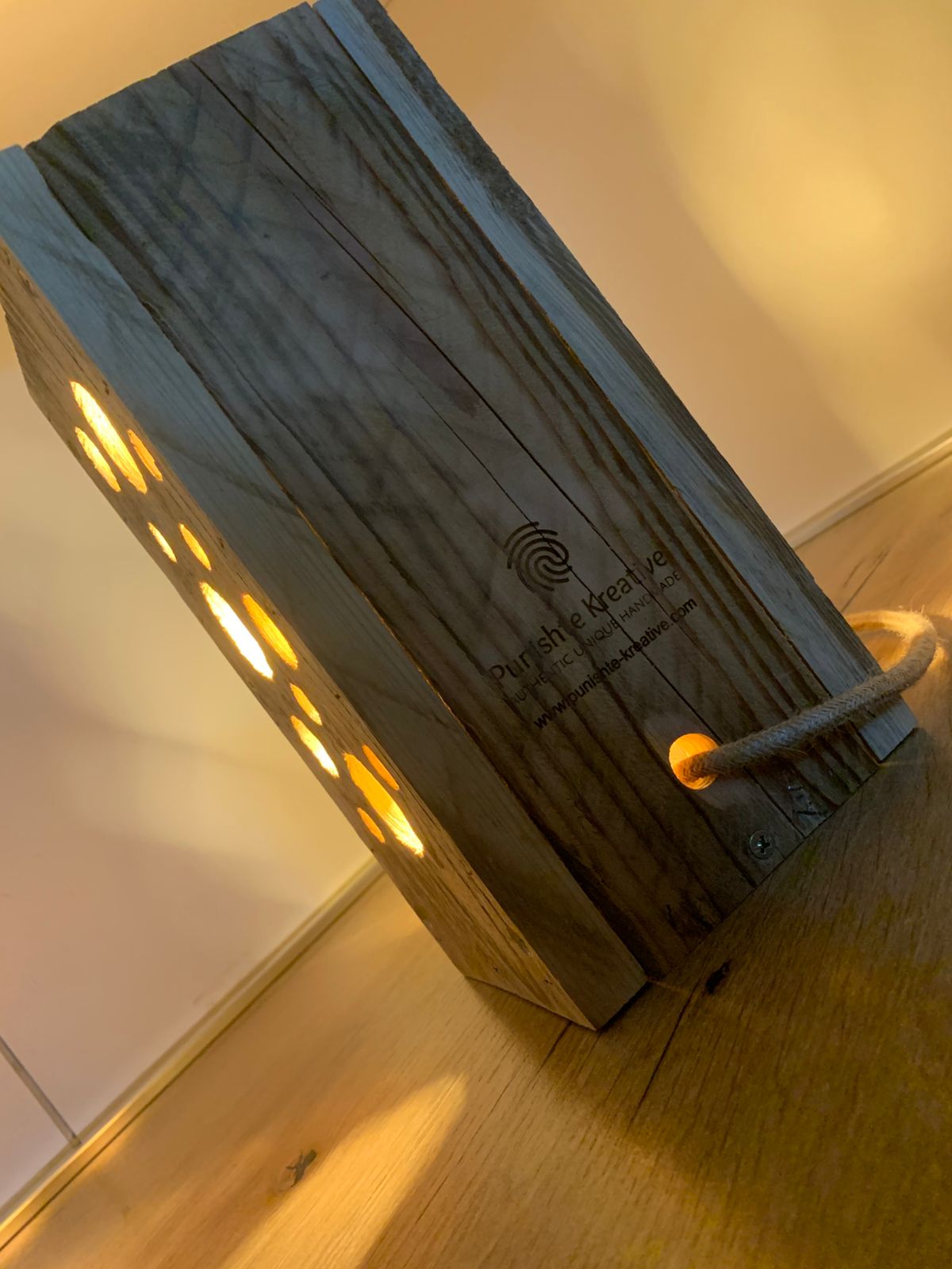 Kjo llambë e punuar me dorë nga dru natyral është shumë më tepër sesa një burim drite   është një copë art dhe ngrohtësie. Çdo vrimë dekorative është prerë me kujdes për të krijuar një lojë magjike drite dhe hije, e cila sjell një ndjesi qetësie dhe harmonie në çdo ambient.